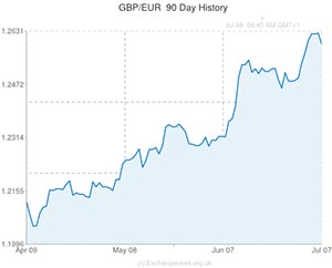The Pound to Euro exchange rate (GBP/EUR) reached a fresh 21-month high of 1.2634 in the early hours of yesterday’s session as investors piled into the Sterling currency in anticipation of a rate hike from the Bank of England before the year is out.