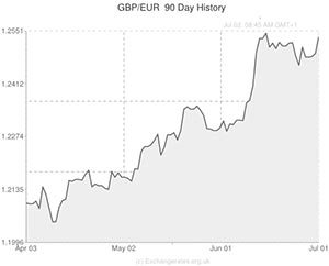 Sterling broke through resistance at 1.25 against the Euro yesterday, rising by around 0.4 cents. GBP to Euro is now within reach of the 20-month high that was struck on June 16th.